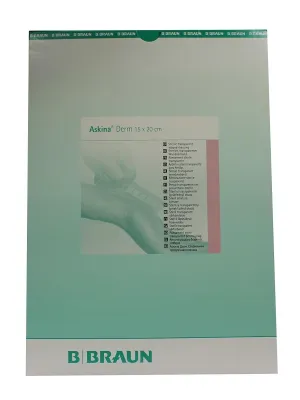 B. Braun Askina Derm AbdeckfolieAskina® Derm Wundverband ist ein steriler, transparenter Verband, der aus einer Polyurethanmembran besteht, die mit einem Acrylatkleber beschichtet ist. Der Verband ist undurchlässig für Mikroorganismen, aber durchlässig für Wasserdampf und Sauerstoff. Der Askina® Derm-Verband hält ein feuchtes Milieu aufrecht, das die Krustenbildung verhindert und den natürlichen Heilungsprozess fördert. Der Askina® Derm-Verband ermöglicht außerdem die visuelle Überwachung der Wunde während des gesamten Heilungsprozesses. Er ist auch für die feuchte Wundheilung mit der Prontosan-Reihe geeignet.