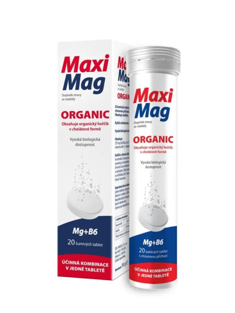MaxiMag Organic sind Brausetabletten mit angenehmem Zitronengeschmack, die dem Körper organisches Magnesium in Form von Magnesiumbisglycinat zuführen – eine der am besten resorbierbaren Magnesiumformen. Eine Tablette enthält 375 mg Magnesium und 0,7 mg Vitamin B6, das die ordnungsgemäße Funktion des Nervensystems unterstützt und zur Verringerung von Müdigkeit und Erschöpfung beiträgt.