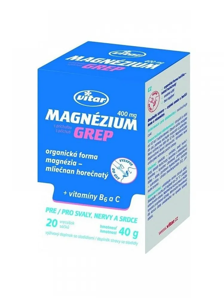 Vitar Magnesium 400 mg ist ein Nahrungsergänzungsmittel mit Grepgeschmack in praktischen Portionsbeuteln, die eine bequeme Einnahme ohne Wasser ermöglichen. Es enthält eine höhere Dosis an Magnesium, das auch in der organisch gebundenen Form von Laktat vorliegt, die für den menschlichen Körper nutzbringender ist. Das Präparat eignet sich als Nahrungsergänzung beim Sport, bei übermäßiger körperlicher Anstrengung oder psychischem Stress.